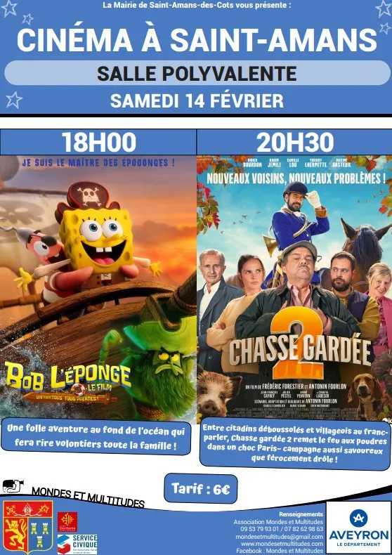Samedi 14 février, 2 séances de cinéma à la salle des fêtes de Saint-Amans-des-Côts. A 18h : Bob l’éponge et à 20h30 : Chasse gardée 2.