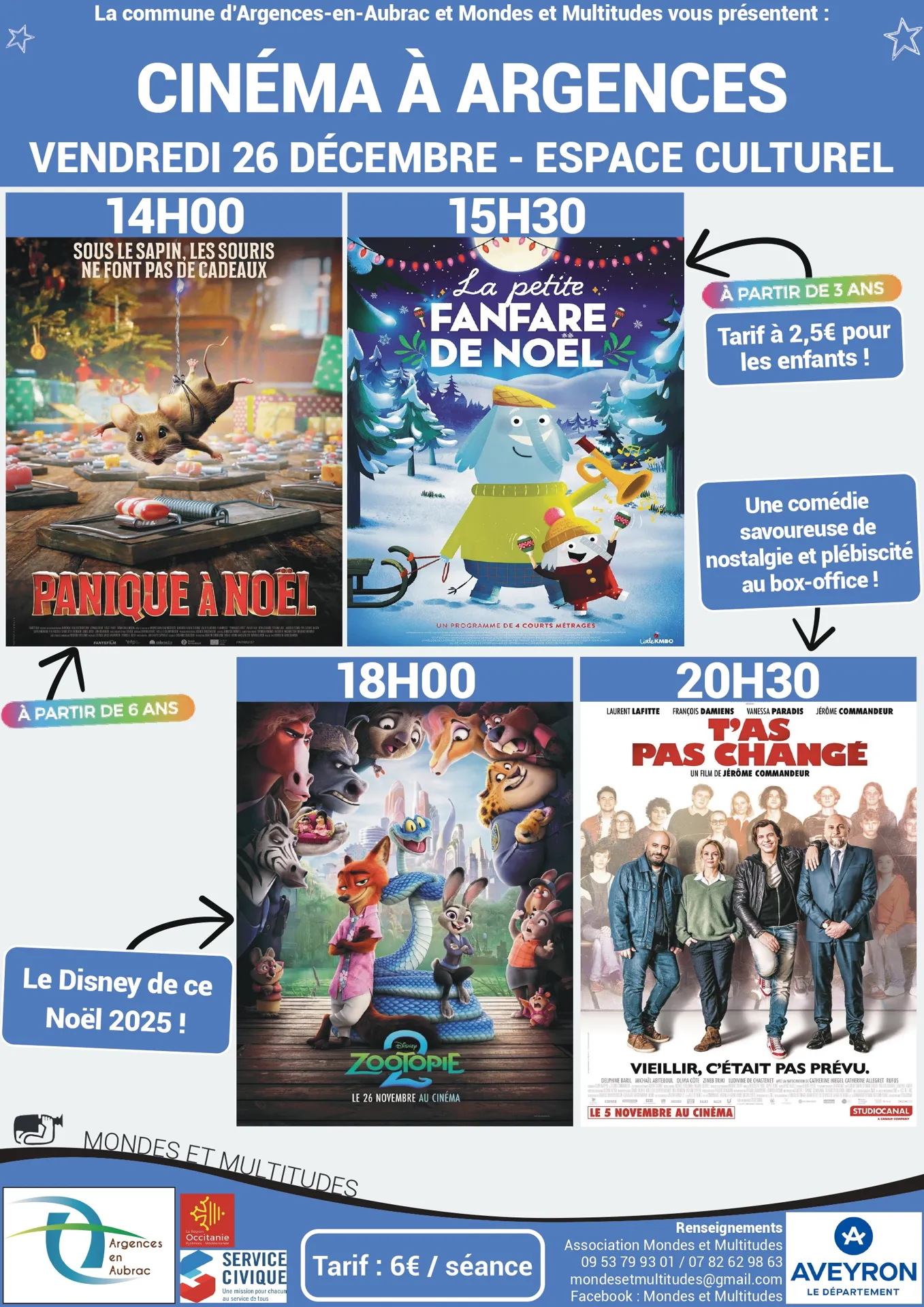 Séances cinéma :14h00 : Panique à Noël (à partir de 6 ans)15h30 : La petite fanfare de Noël (à partir de 3 ans)18h00 : Zootopie 220h30 : T’as pas changéGoûter offert pour les spectateurs avant la séance de 18h00